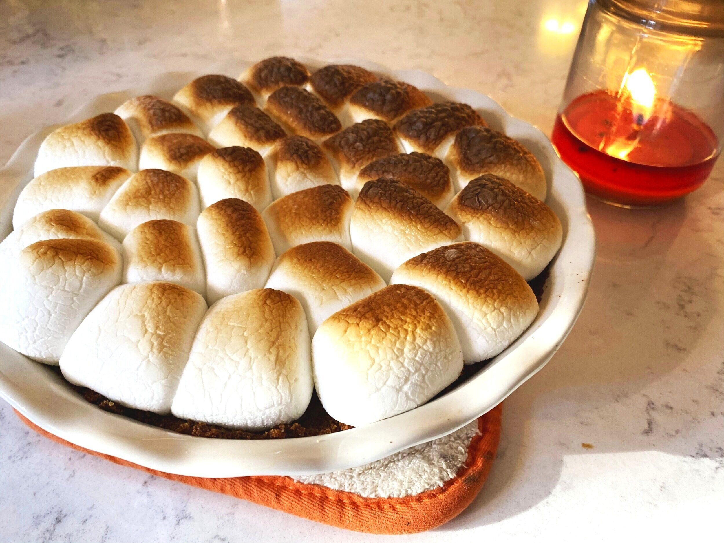 5. Bake for 28 minutes. Remove from the oven and top with marshmallows. Return to the oven and turn on your broiler for 1 minute. Remove from the oven and allow to cool to room temperature before slicing. Run a very sharp knife under warm water when slicing; it helps slice neat pieces.